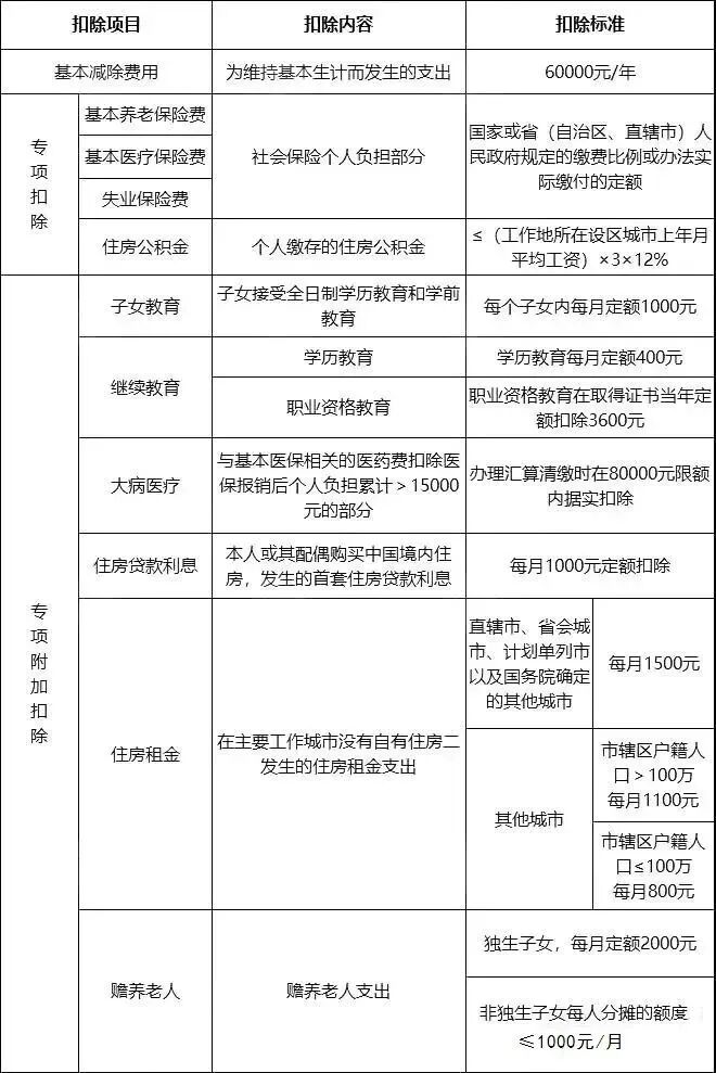 5、住房租金:在主要工作城市没有自有住房而发生的住房租金支出,直辖市、省会城市、计划单列市以及国务院确定的其他城市,每月1500元;其他城市,市辖区户籍人口>100万,每月1100元,市辖区户籍人口≤100万,每月800元。